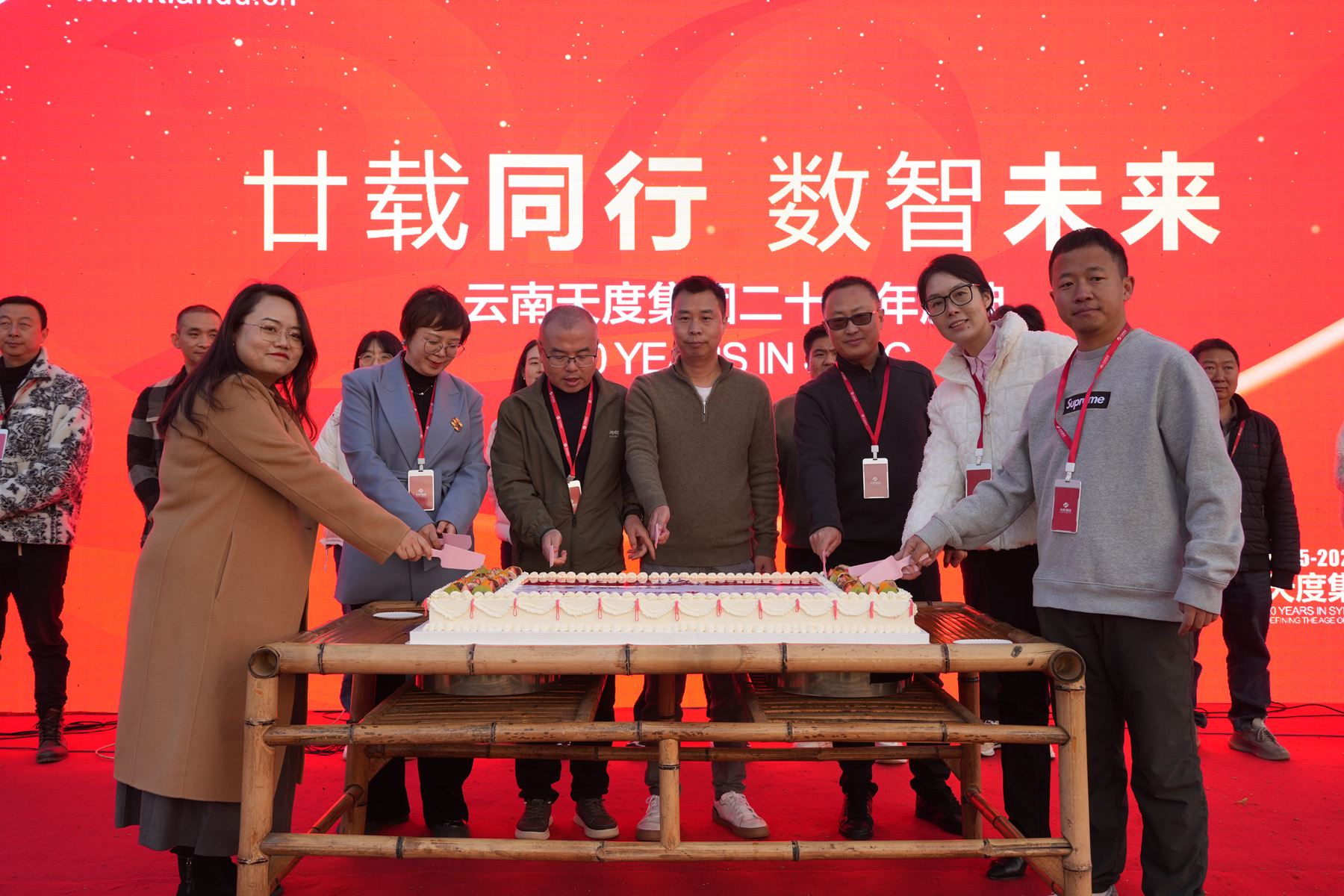 隨后,鄭桂文董事長率集團(tuán)高管團(tuán)隊(duì)共同切開精心設(shè)計(jì)的二十周年巨型慶典蛋糕。甜蜜的喜悅,由所有天度人共同分享,將現(xiàn)場氣氛推向首個(gè)高潮。